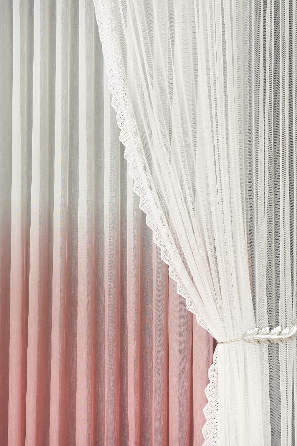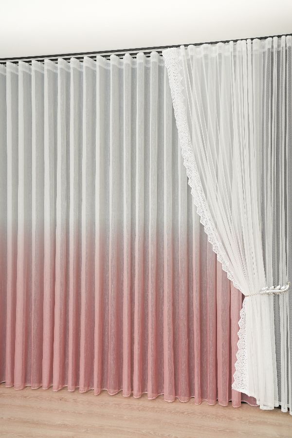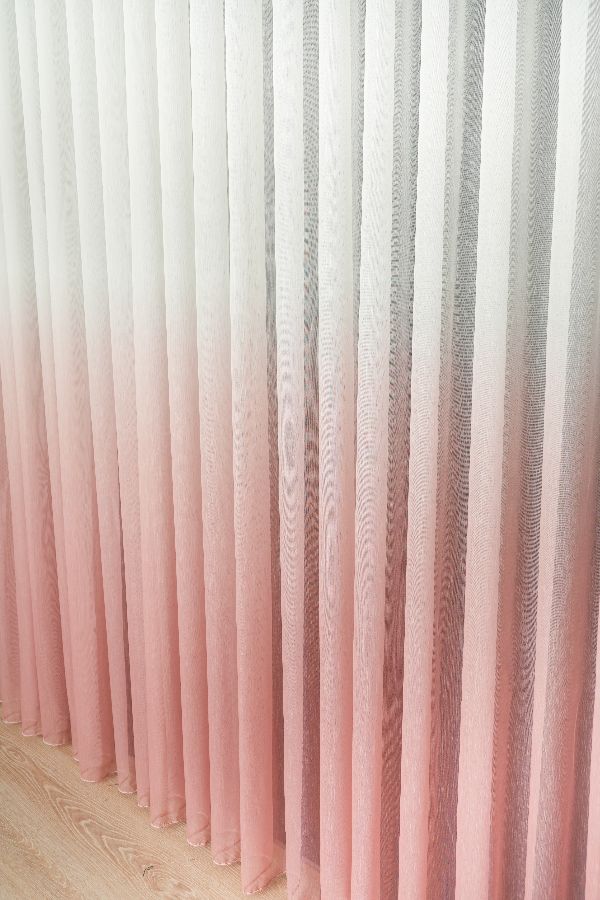 Roze ombre zavesa ima prelepu nijansu koja postepeno postaje svetlija i na kraju prelazi u belu boju.