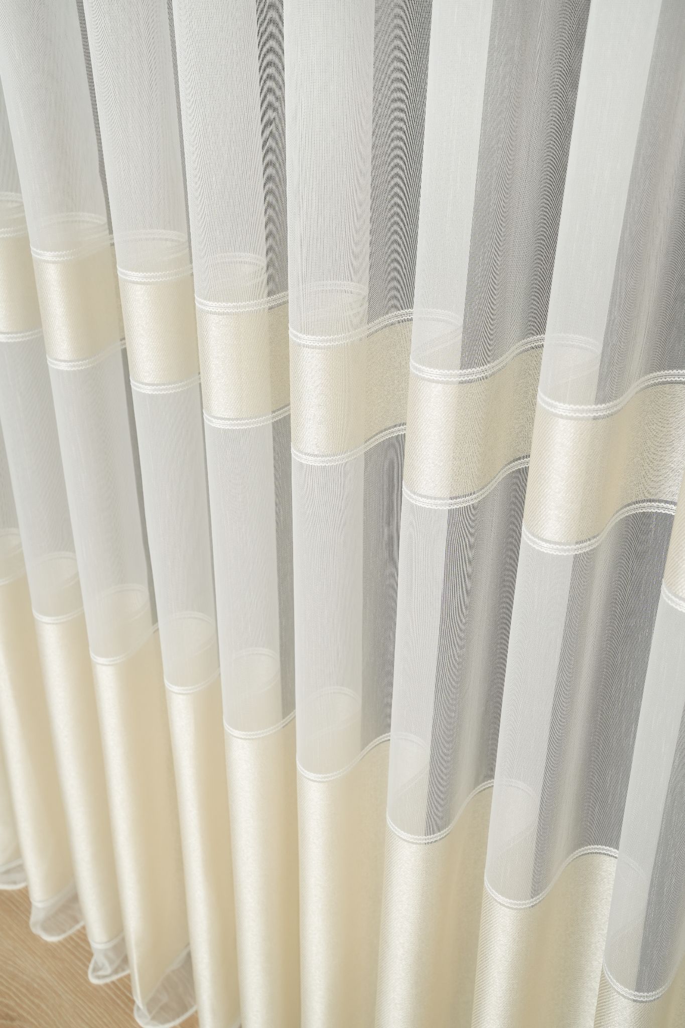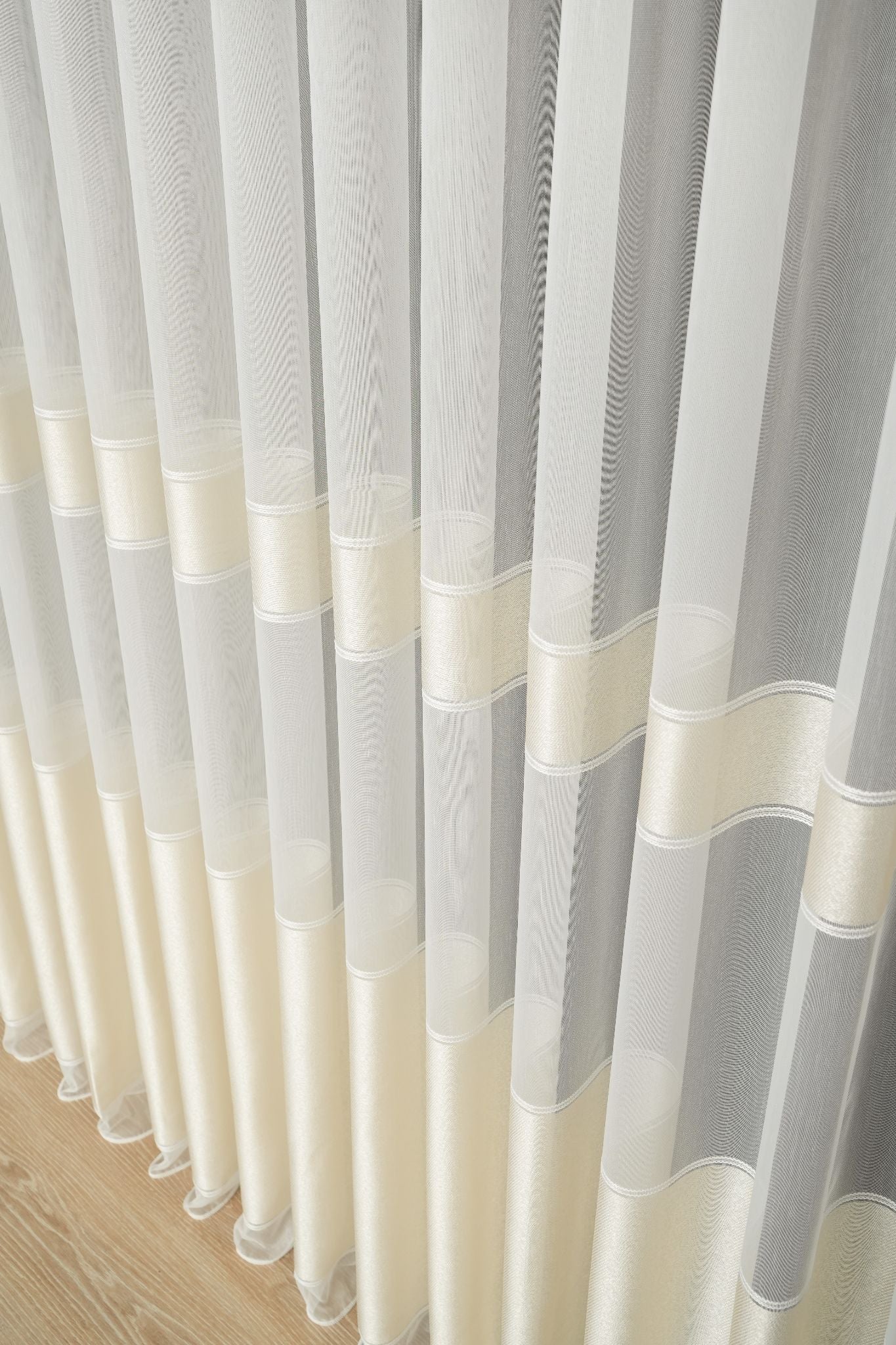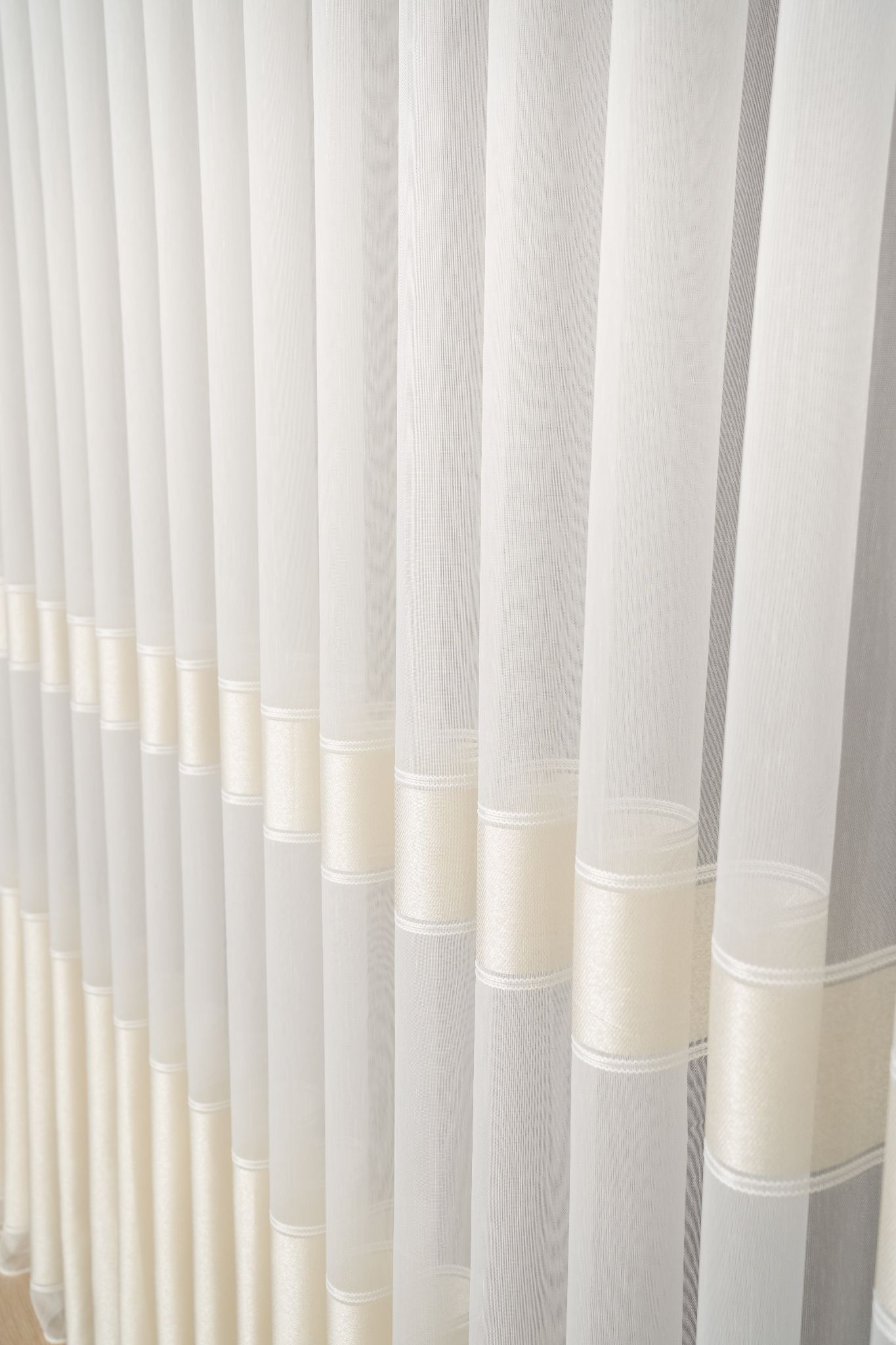 Dve bež pruge ističu vertikalne linije i daju utisak visine i prostranosti. Zavesa deluje elegantno i moderno, ali ostaje nenametljiva – savršen izbor za dnevne sobe, trpezarije i spavaće sobe u kojima želite miran, umeren ton.