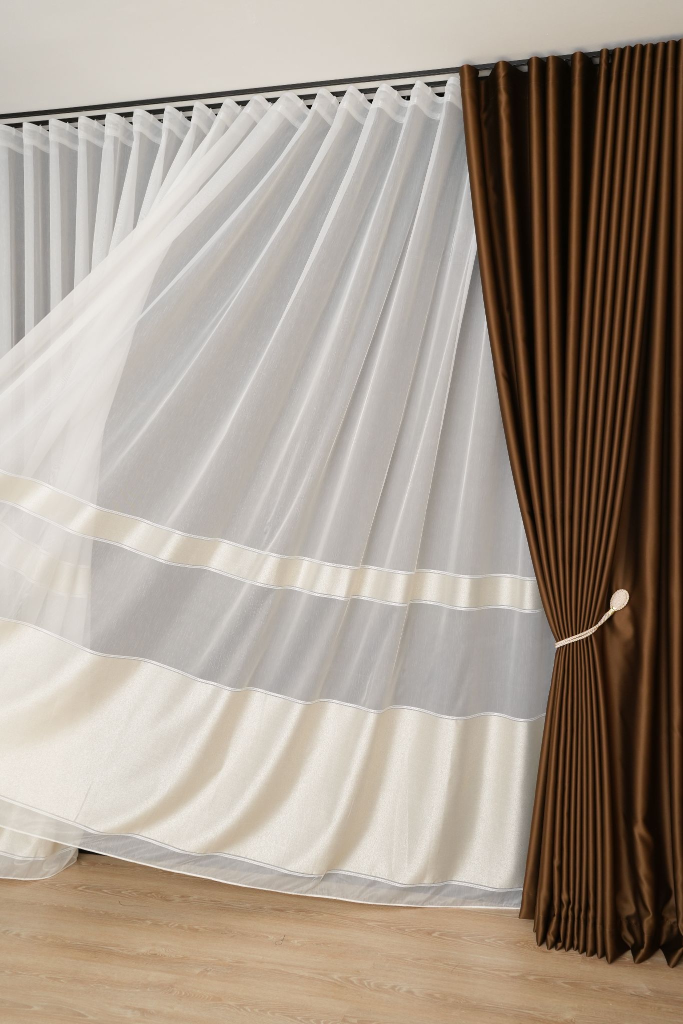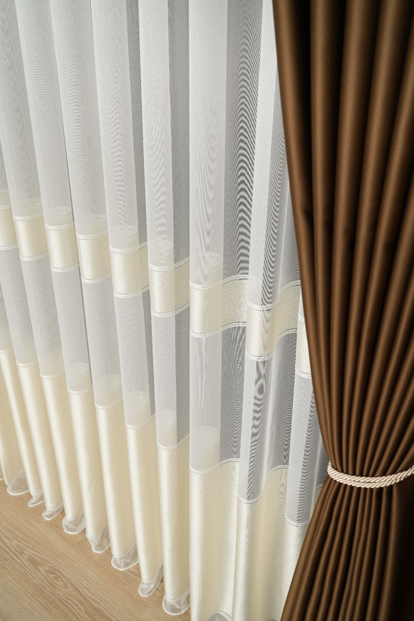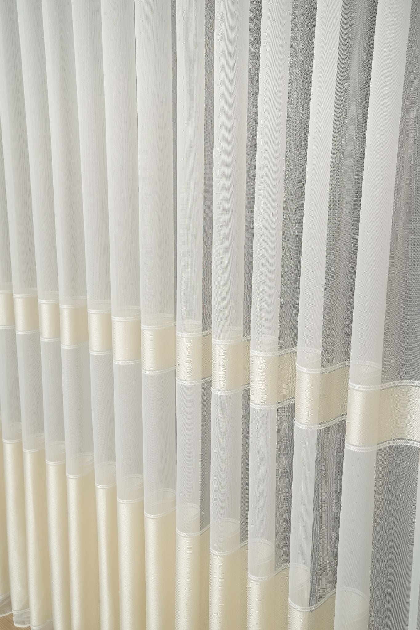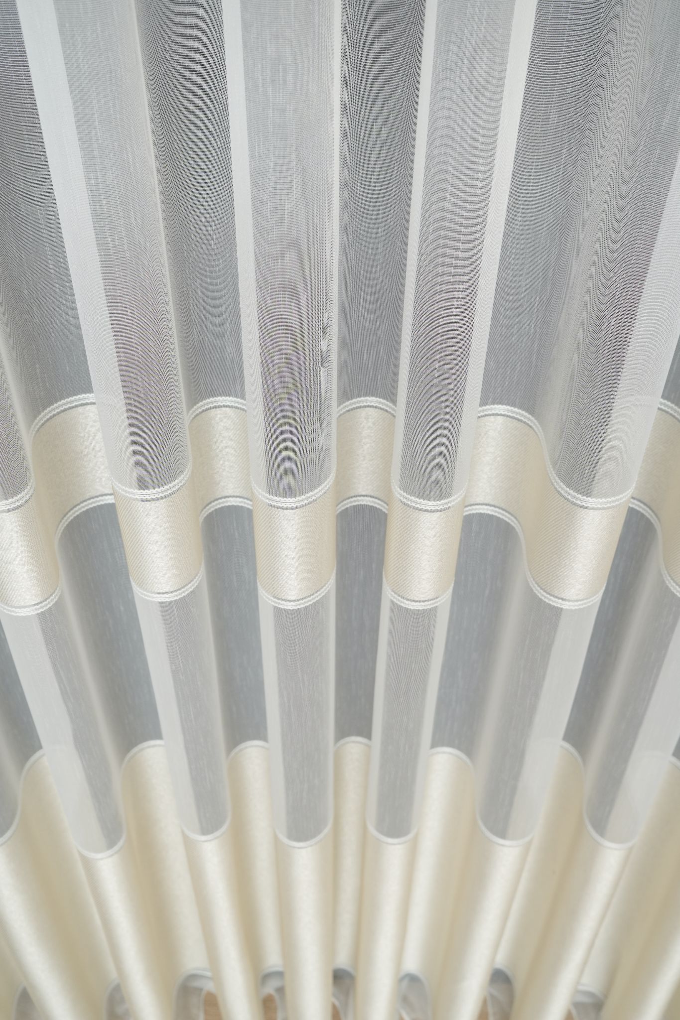 Dve bež pruge ističu vertikalne linije i daju utisak visine i prostranosti. Zavesa deluje elegantno i moderno, ali ostaje nenametljiva – savršen izbor za dnevne sobe, trpezarije i spavaće sobe u kojima želite miran, umeren ton.